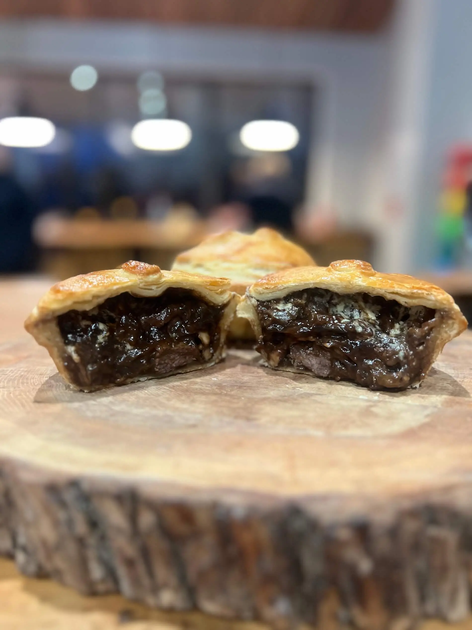 A luxurious savoury pie crafted with tender, slow-braised Black Origin Wagyu beef, earthy shiitake mushrooms, and aromatic black truffle, all encased in buttery, flaky pastry. Finished with a bold crumble of blue cheese for a punch of umami and tang. $12.50